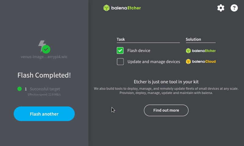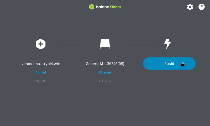 Inserite la Micro SD nel PC, aprite Balena Etcher, selezionate l'immagine di Venus OS, poi la Micro SD e cliccate su "Flash".