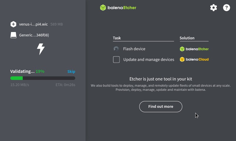 Utilizziamo Balena Etcher per installare l'immagine di Venus OS nella Micro SD.