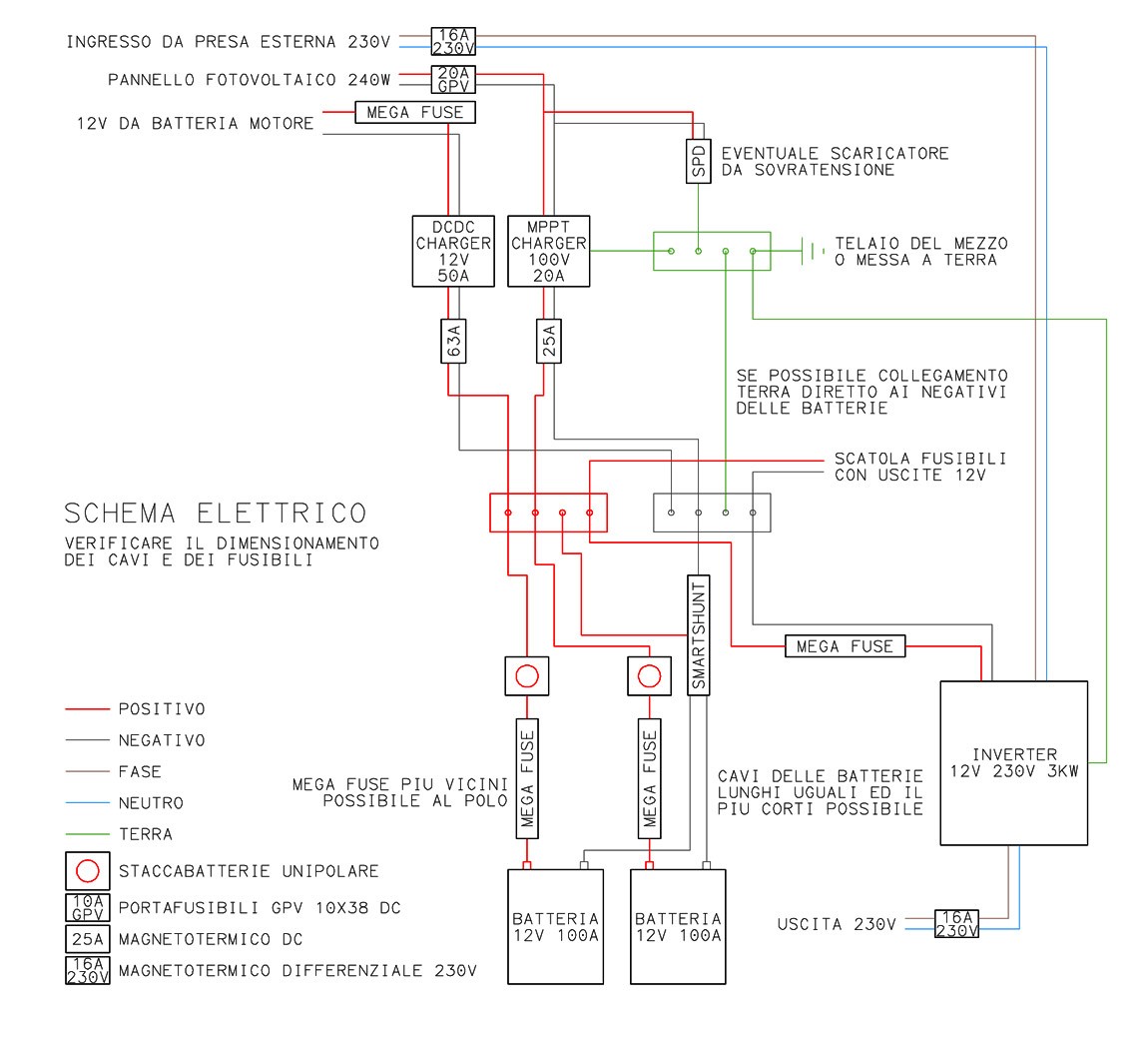 Non vengono appositamente specificati gli spessori dei cavi e tutti i tagli di fusibili e protezioni, che devono essere dimensionati correttamente in base alla lunghezza dei cavi stessi e dei prodotti effettivamente installati.