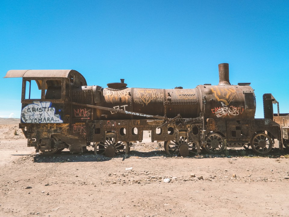 Nella periferia di Uyuni, in Bolivia, si trovano treni e locomotive arrugginite, scavati dai venti salati, resti di un progetto di espansione dei trasporti.