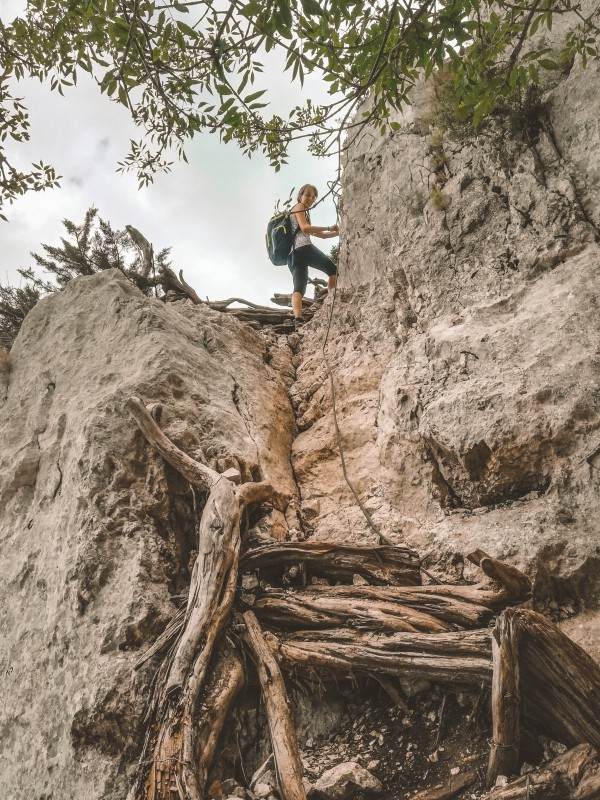 La discesa a Cala Mariolu è stata più impegnativa del previsto, perchè le alte falesie scendono a picco sul mare. Il sentiero non è molto tracciato e ci sono numerosi passaggi su roccia o su scale traballanti.