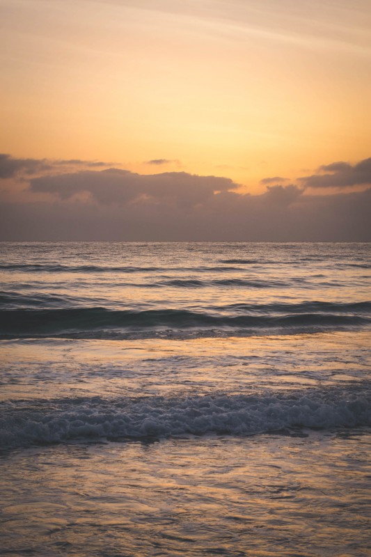 Al mattino presto la spiaggia era deserta, solo i gabbiani solcavano il cielo tinto di sfumature rosa, gialle e arancioni; eravamo circondati da un silenzio profondo, rotto solo dal lieve frusciare delle onde sul bagnasciuga; il sole all'orizzonte faceva capolino dalle nuvole basse.