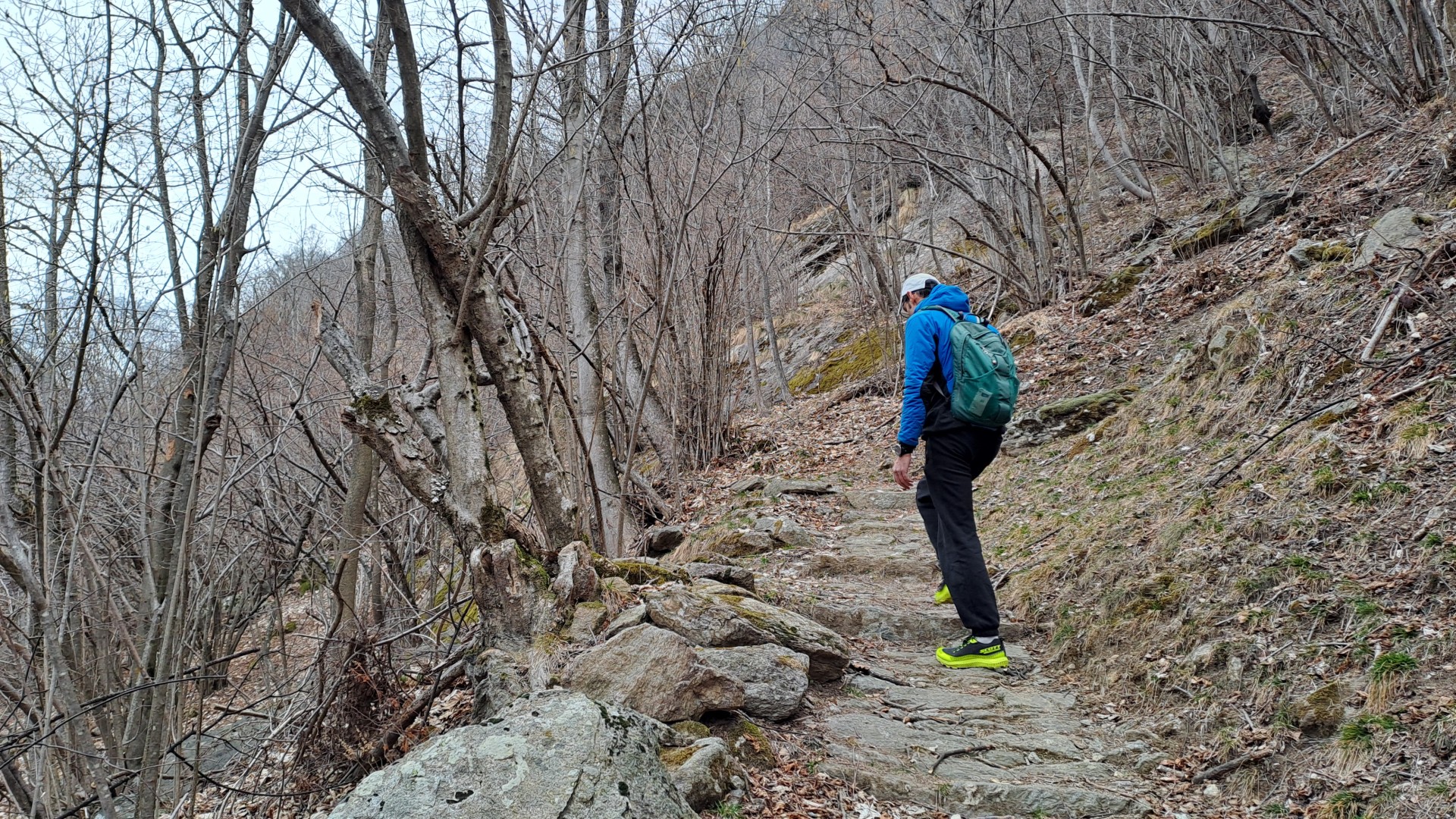 Dopo 100 metri, incontriamo un incrocio segnato da cartelli e seguiamo a destra il ripido Sentiero dei Mufloni. Si tratta di una vecchia mulattiera che sale con grande pendenza nel bosco: è piuttosto sconnessa, tutta a sassi e gradini, quindi consigliamo scarpe da trekking. In circa 40 minuti, dopo 300 metri di dislivello, arriviamo a Tissone, una delle tante frazioni della Val Chiusella. Si tratta di un piccolo paese con le caratteristiche case di pietra. Non è molto frequentato, soprattutto in inverno, infatti qui abbiamo la fortuna di vedere 4 caprioli.
